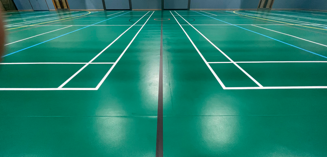 Typically used in Sports halls after 1990. There are 3 common makes: Taraflex, Tarkett & PU.